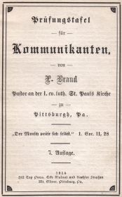 According to the 1914 forward of this 23 page German pamphlet, this tool for self-examination and preparation for holy Communion was in such demand that a seventh printing was necessary. The review of the pamphlet mentioned therein refers to an 1884 issue of Der Lutheraner, some thirty years before, indicating the longevity this tool enjoyed in its usage. It includes a primer for the theology and practice of holy Communion quoting both Luther in the Larger Catechism and Walther in his Postils. The four-fold self-examination is summarized based on quotations from Luther as to how one is to examine himself for sin and faith. The Examination Table itself is based on specific questions organized under the Ten Commandments, followed by sections of general questions to examine the penitent's proper regard for the seriousness of sin, the state of his contrition, the state of his faith and the state of his desire for holiness or sanctification. Its finale is an exhortation to the penitent to let nothing hinder him from bringing his sins and himself to the only source of strength to extinguish and defeat sin and weakness of faith and bring forth sanctification, that is, Christ in Holy Communion.